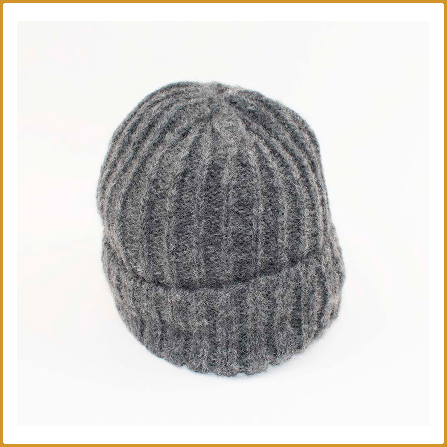 Bonnet unisex en laine d’alpaga 100 % cousu à la main par les artisans. Couleurs brun-beige, gris et noir.